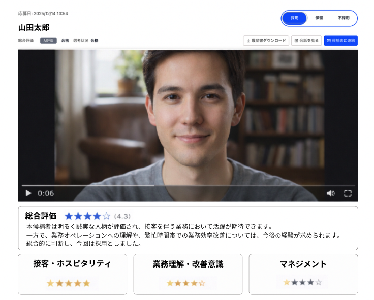 AIが面接結果をスコア化し、職務適性・ポテンシャル・コミュニケーション力を数値で評価します。